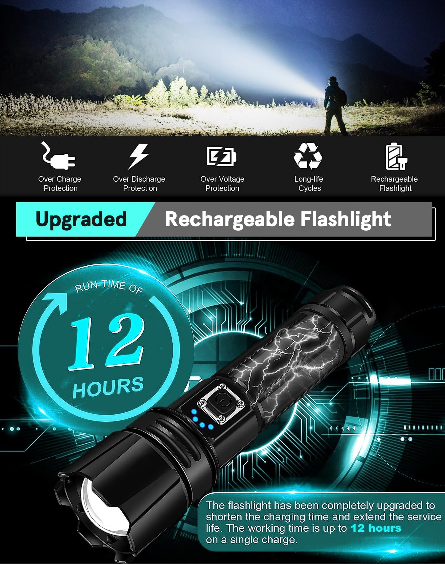 - BATTERY - This 20000 lumen torch with high lumens has built-in fast charging chip. Takes 4-5 hours to fully charge and lasts up to 12 hours. This ANTWIS tactical flashlight with LED display power indication (25%, 50%, 75%, 100%). Convenient to full and timely power off, prolong the service life of powerful flashlights. Supplied with 3 * AAA batteries for backup.