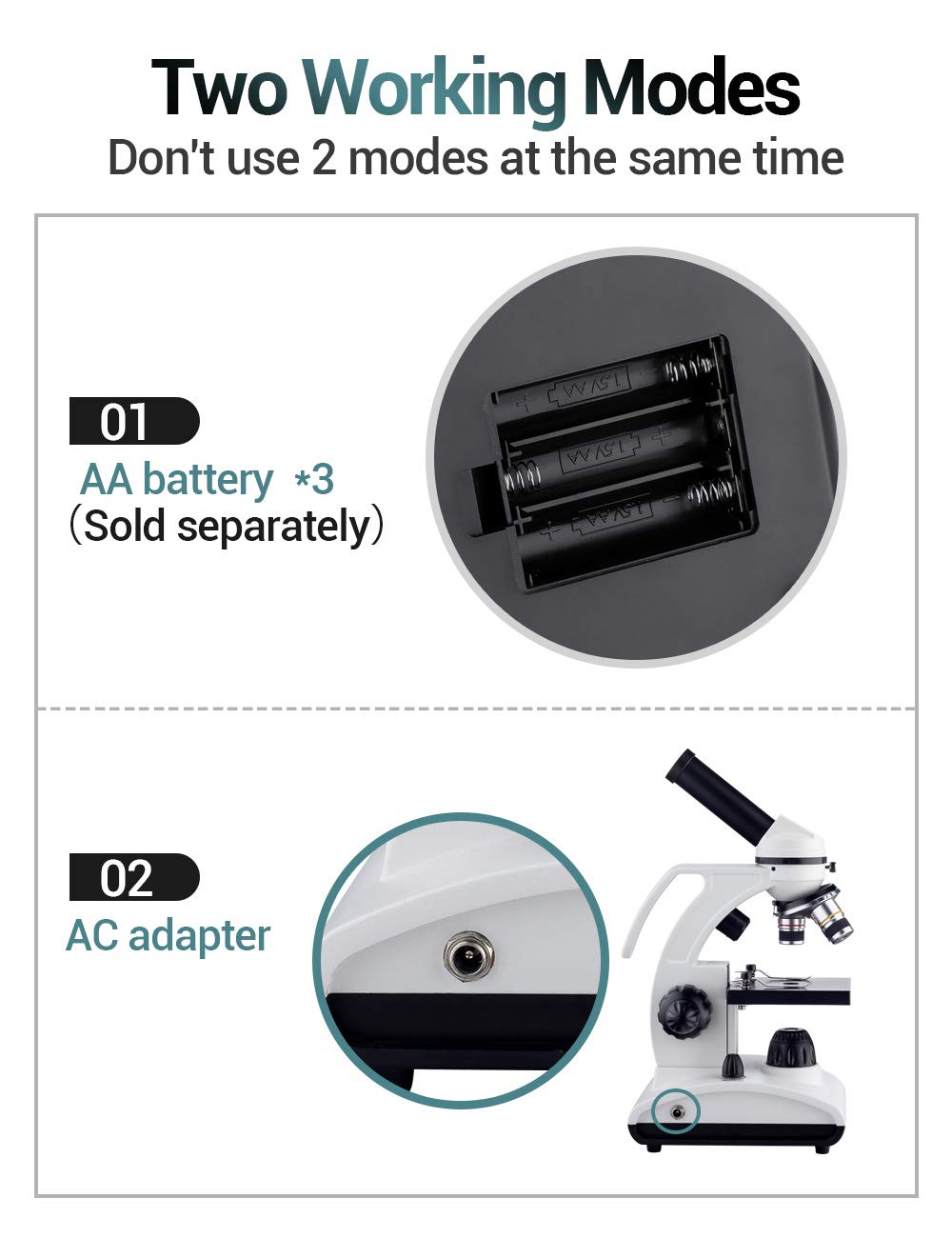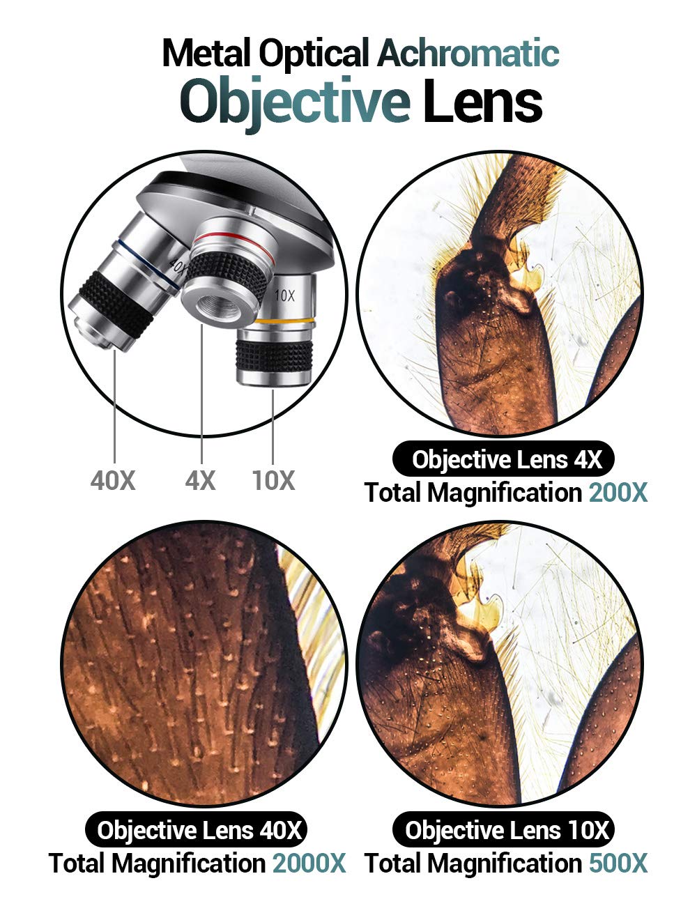 - 100x-2000x microscope: With a 25X eyepiece, 4x, 10x, and 40x objective lens, plus an exclusive custom 2x Barlow lens, the slides is magnified and observed up to 100-200-250-500-1000-2000x.