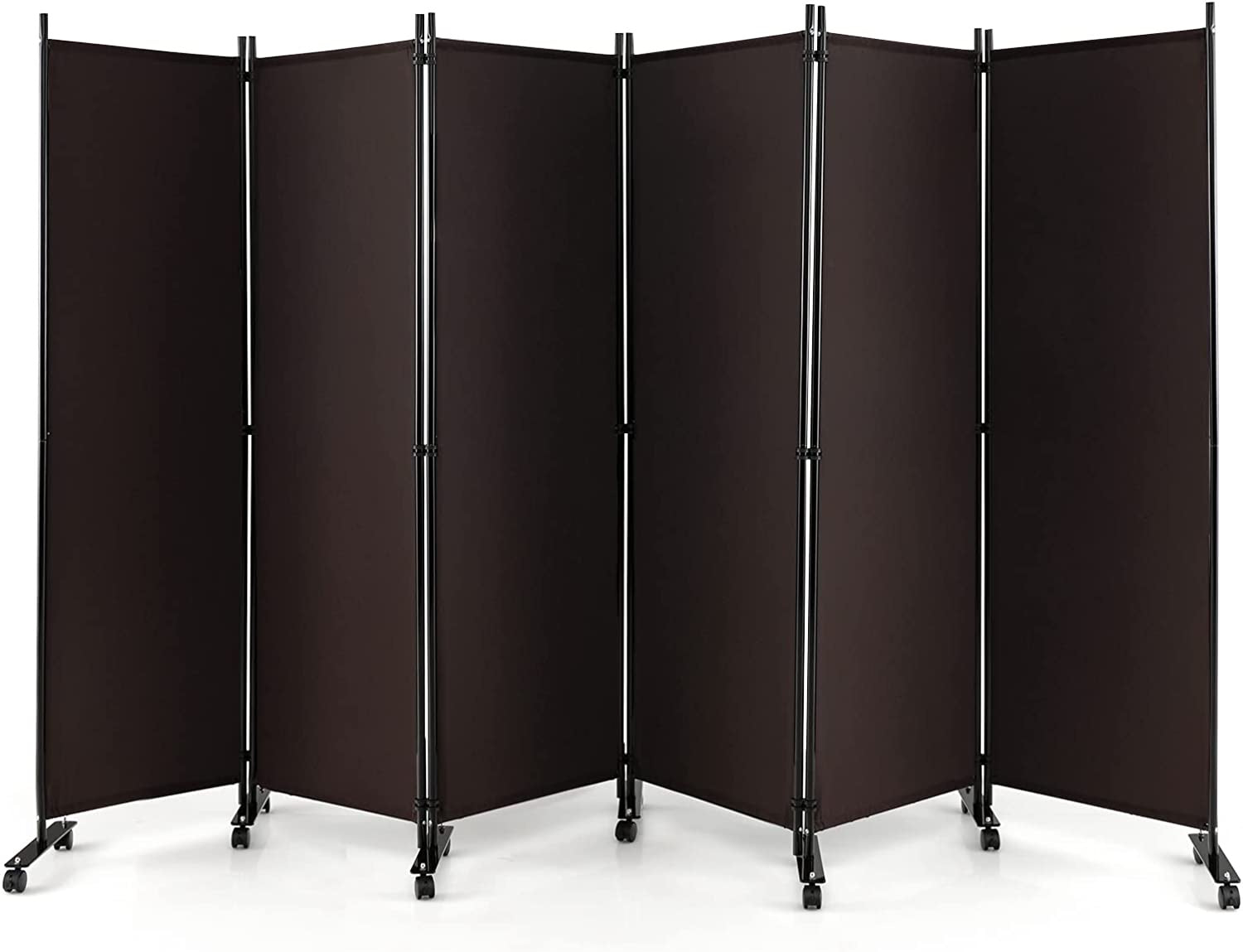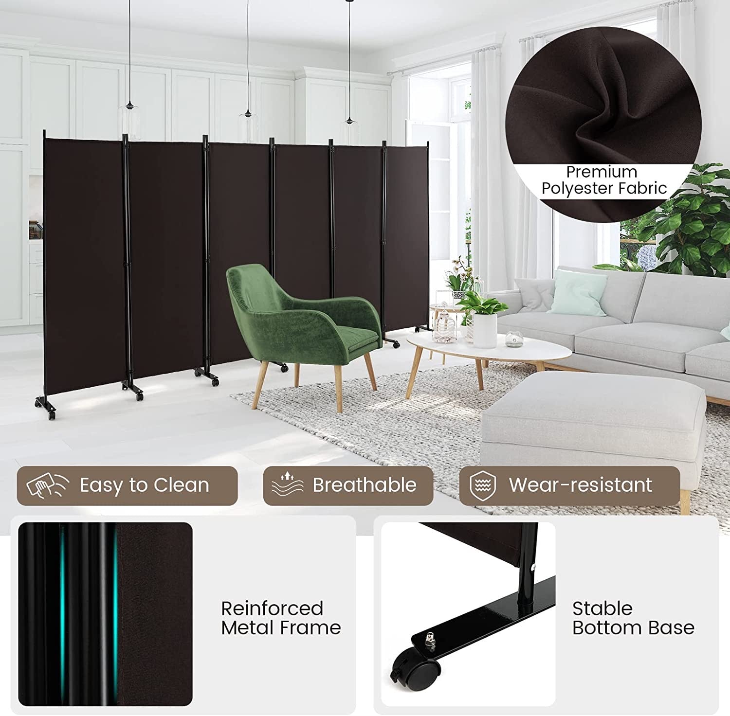 Have you ever been troubled by the unreasonable room layout in your home? The 6-panel room divider will help you solve the problem. Crafted of premium polyester fabric and supported by a metal frame, the privacy screen features great durability and wear resistance and long-lasting use. Thanks to plastic connectors, the panel can be easily turned in either direction or folded to suit different needs. The room partition is equipped with lockable wheels for easy movement and higher stability. In addition to providing a private space in your office, the folding privacy screen can be placed in front of the window to block sunlight or used as a great decoration for your home.