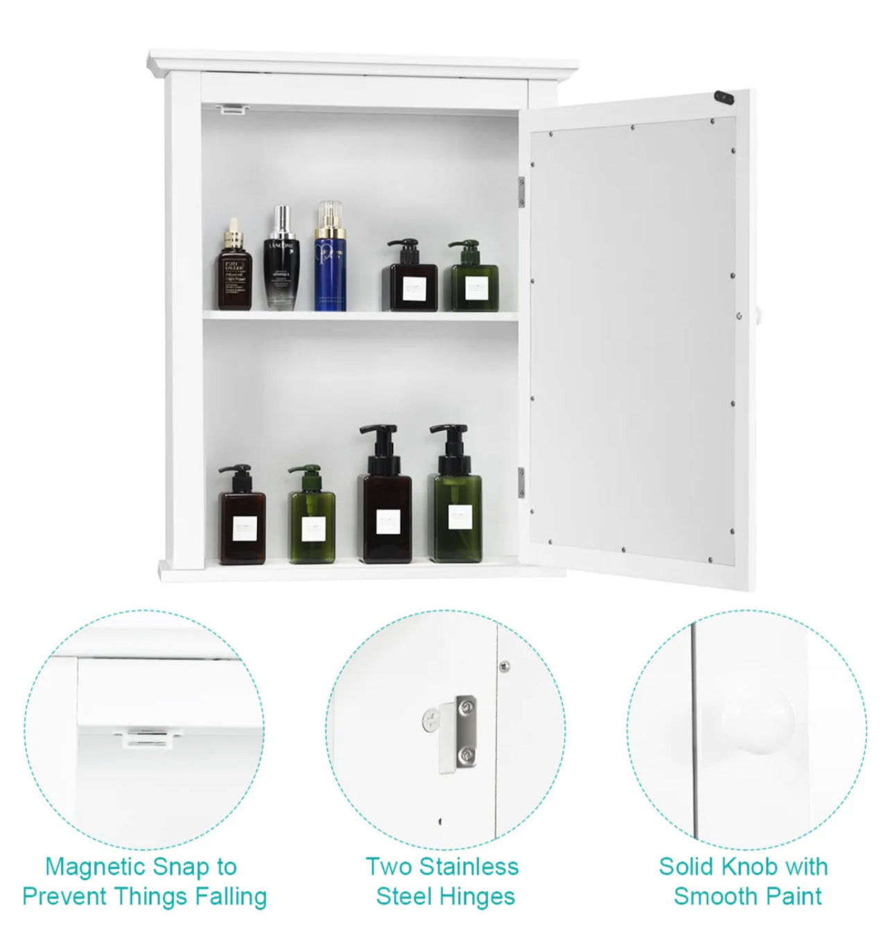 The wall mounted mirror cabinet which combines modern style and practicability is ideal to use in your bathroom. With white finish and elegant appearance, this mirror cabinet will well match with your furniture in your home. It can perfectly blend in various decoration styles and leave your guests a deep impression. Featuring 2-tier inner space with mirror, this cabinet will add other storage space for your room. There is sufficient space to store and organize your linens, toiletries, and bath essentials like soaps, shampoos, body wash, and more. And the design of door not only can hide the item but also keep moisture and dust out. Our cabinet made of thick density board and painted with smooth paint which ensures durableness and sturdiness of the cabinet. Therefore, this mirror cabinet can provide long time service for your family.