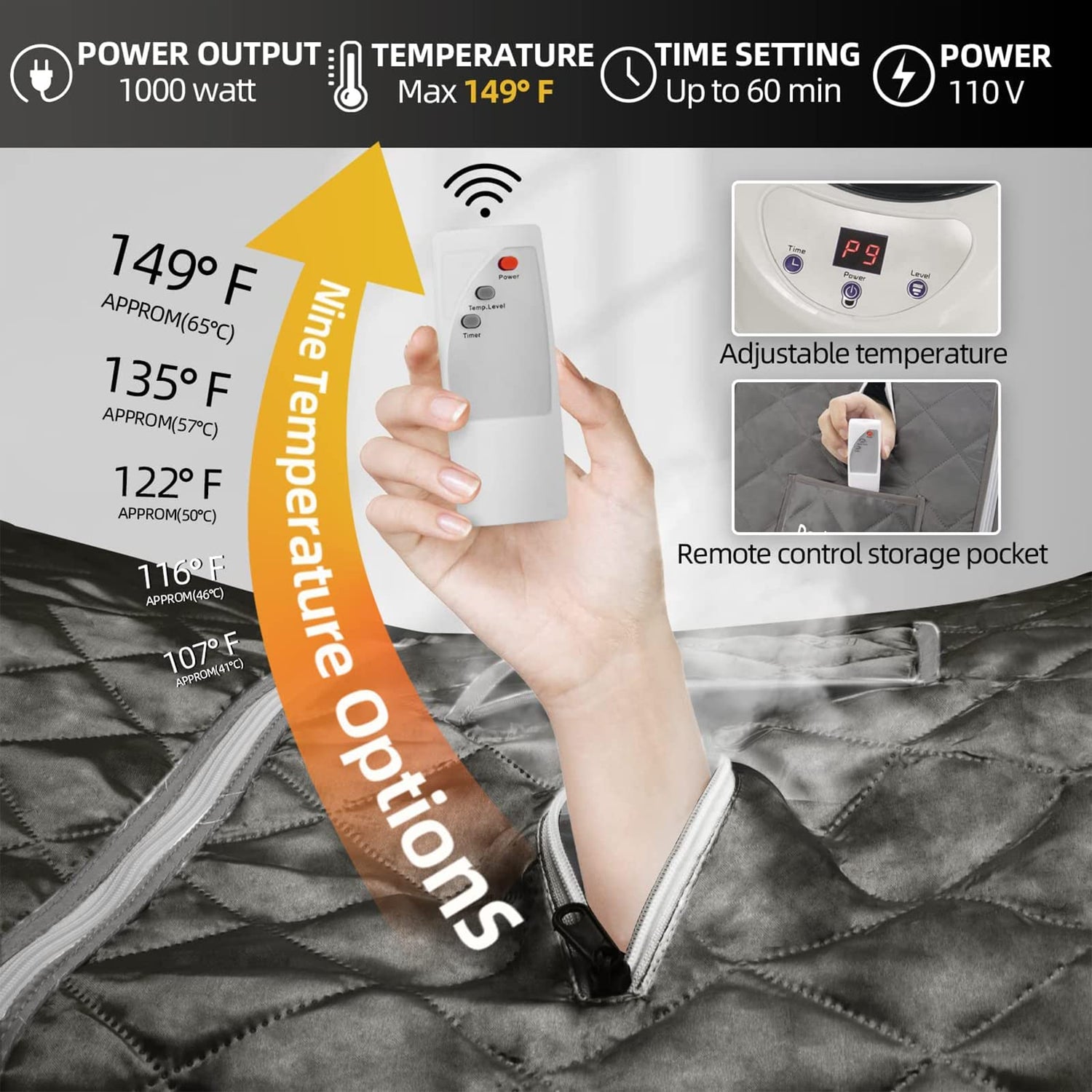 - Remote Control: This portable steam sauna tent comes with a comfortable collar and hand-held remote control. And power and time can be easily adjusted by a remote control or 2L steamer button. The front pocket and two zipper openings of the sauna allow you to keep your necessities nearby and free your hands.