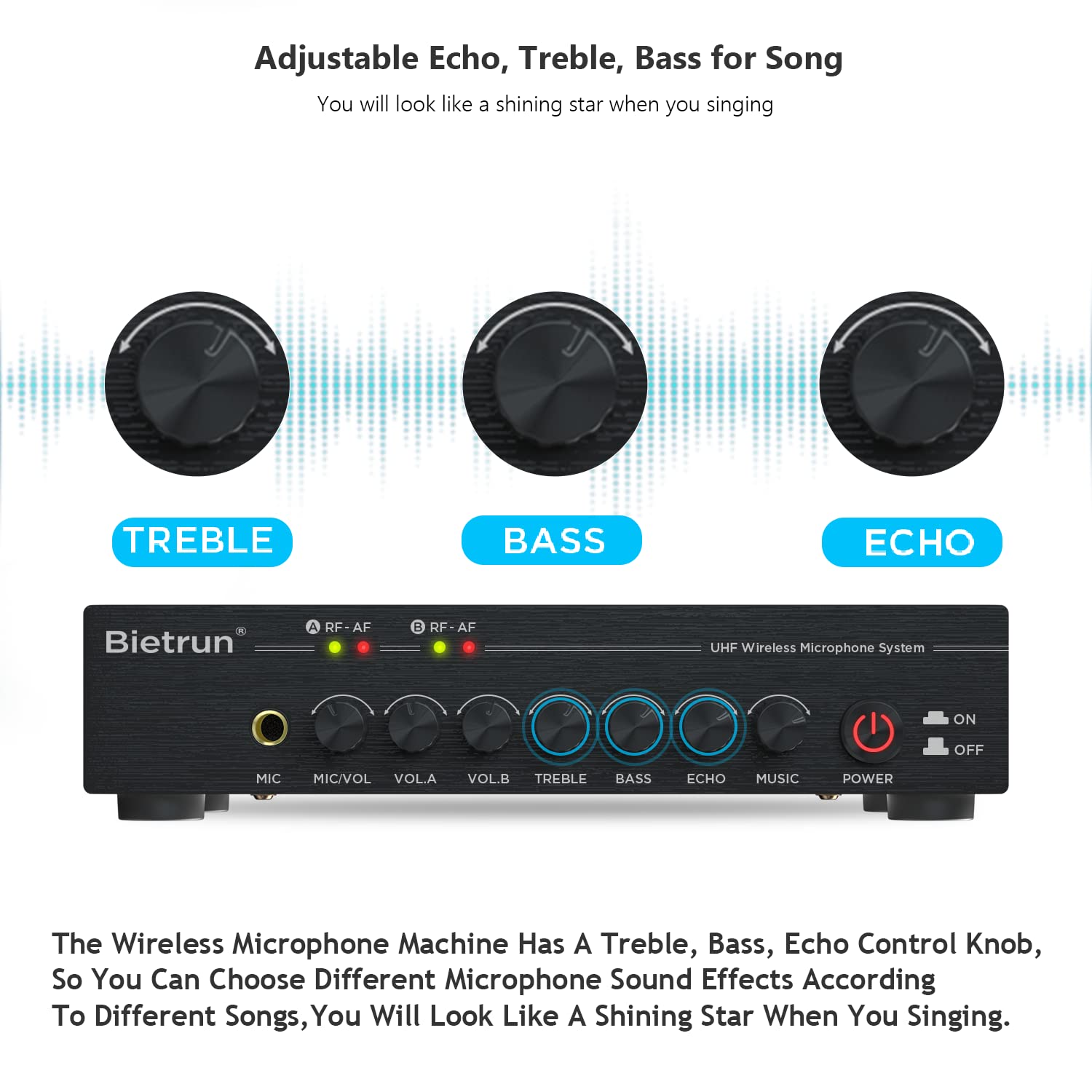 • Wireless Microphone System With Treble/Bass/Echo: The Wireless Microphone Machine Has A Treble, Bass, and Echo Control Knob, So You Can Choose Different Microphone Sound Effects According To Different Songs, You Will Look Like A Shining Star When You Sing. This Wireless Microphone System Has Bluetooth Function, You Can Use Your Phone To Connect To It Via Bluetooth( Bietrun 06) To Play Your Favorite Music. Please Not Using Rechargeable Batteries.