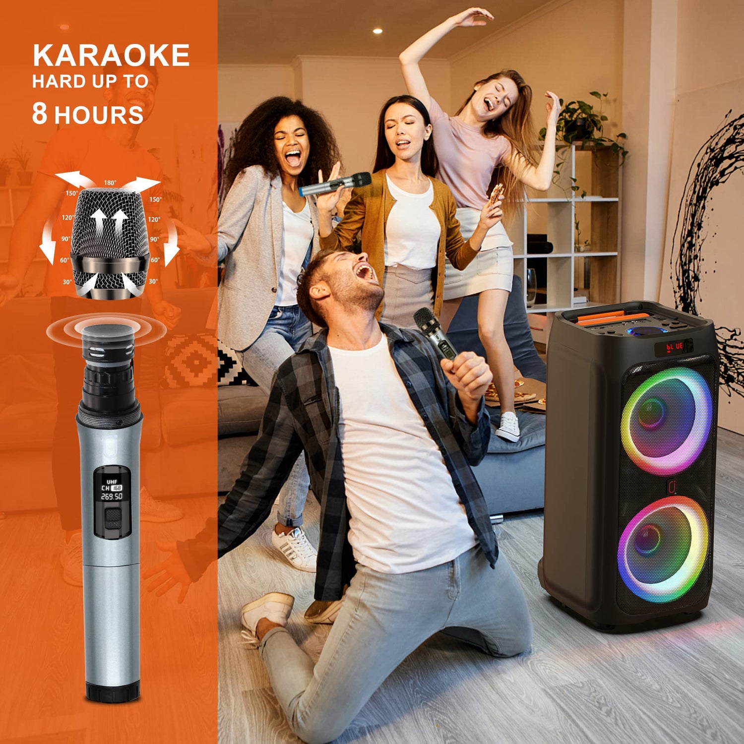 - One more microphone, twice the fun: Karaoke for one is free and fun, karaoke for two is double the fun. Include two UHF wireless microphones with clear sound quality to amplify your voice perfectly. They will automatically pair with the speaker when you switch them on, ready to play. The speaker also has two extra microphone jack for you to connect more mics.