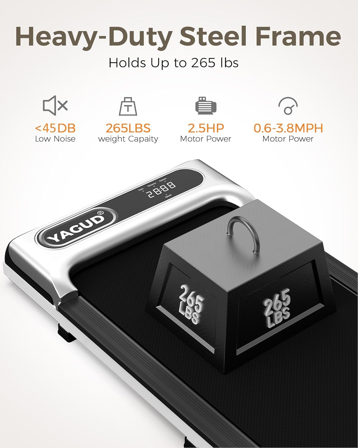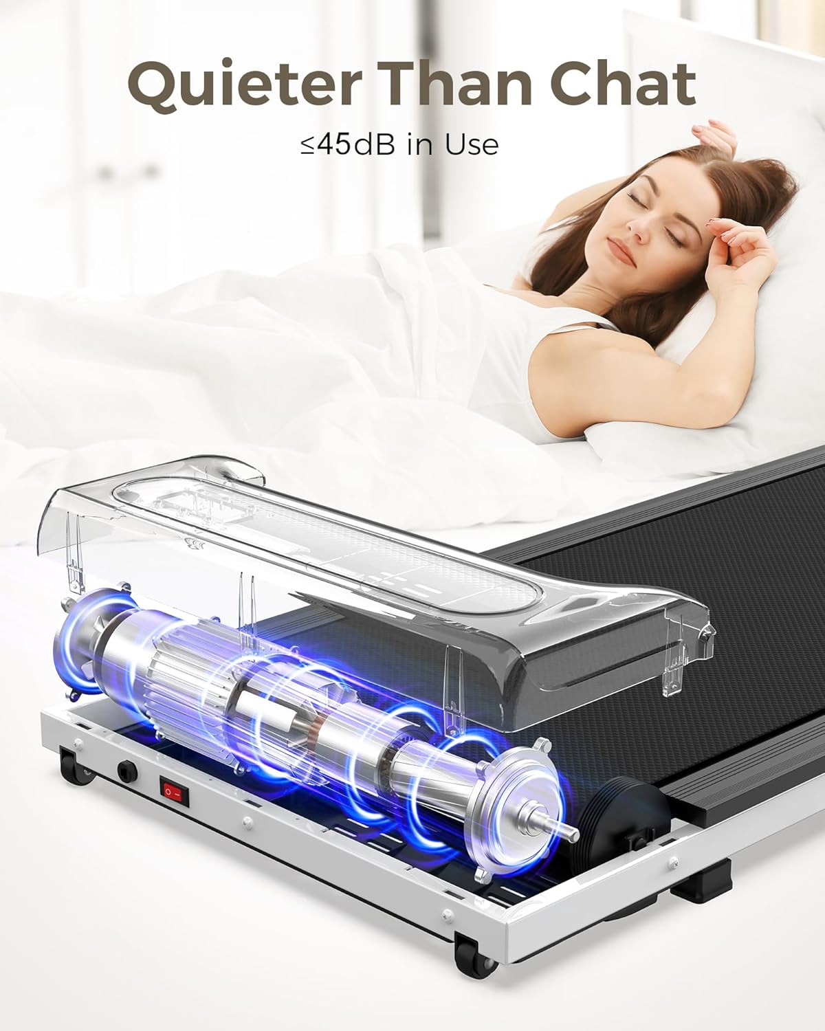 - 2.5HP Powerful & Silent: The walking pad treadmill is equipped with a powerful 2.5HP motor that can hold up to 120 kg. Running area of 98.0 x 38.0 cm. Usage noise is less than 45 DB, allowing you to use it in your office or home without worrying about disturbing others. Enjoy a quiet and comfortable workout with the portable treadmill!