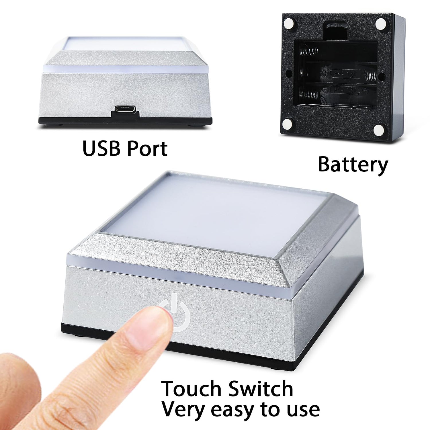 The touch switch on the base is easy to use. You can power it using batteries or connect it to a power source with a USB cable.