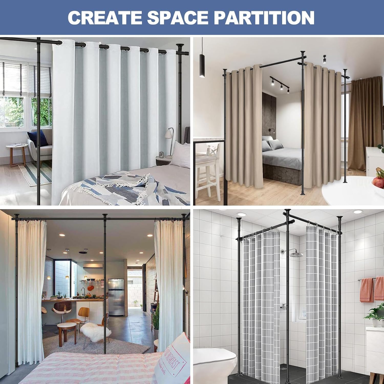 - No Drill Room Divider: This no-drill room divider curtain rod will not leave holes or damage in walls or ceilings, so it's an ideal solution for hard-to-install areas such as rental homes, apartments, dorms, etc. And tt's suitable for any hard surface such as tile floors, wood floors, plaster ceilings, popcorn ceilings, textured ceilings and so on.