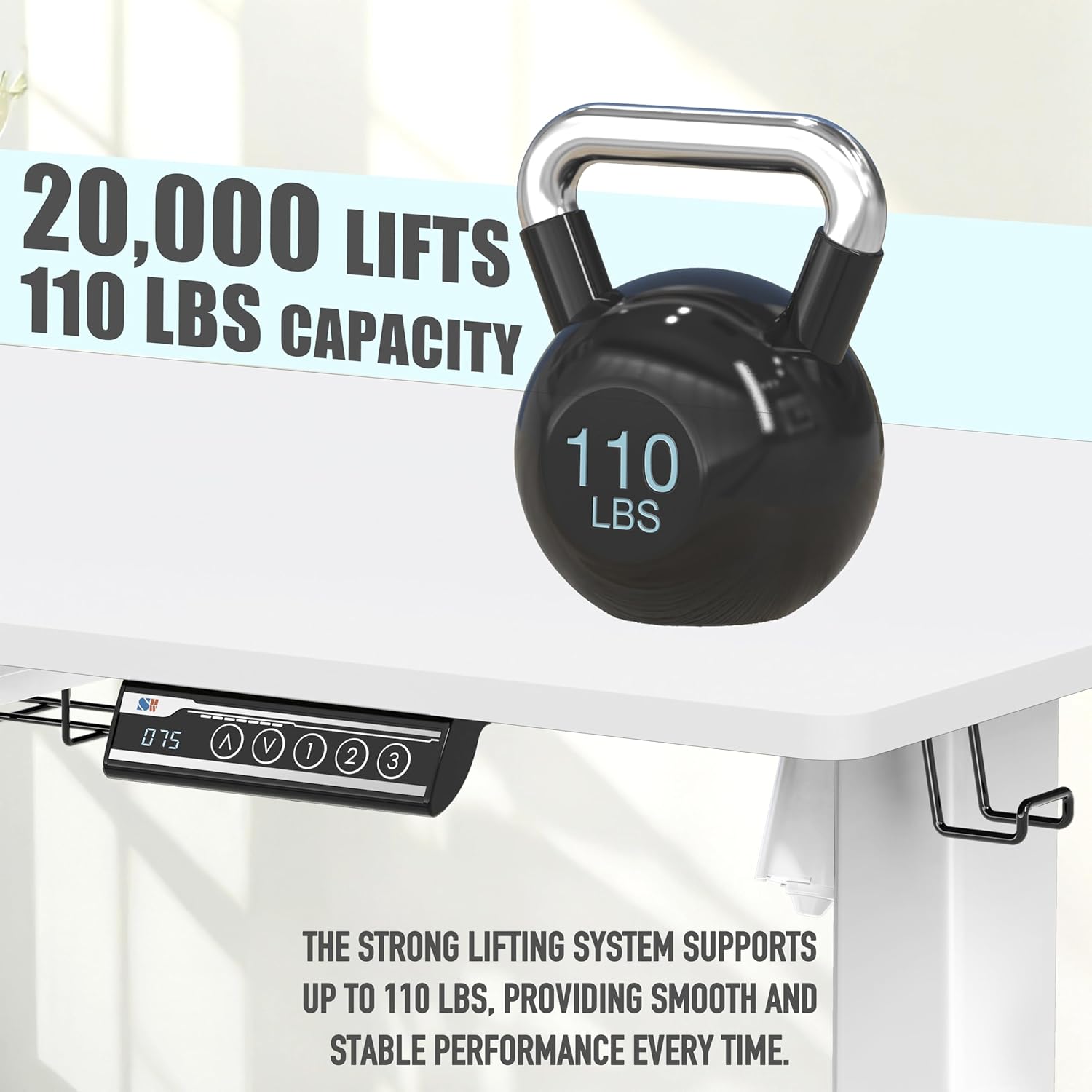 Electric Standing Desk, Whole Piece Desktop Height Adjustable Sit to Stand Desk with Hanging Hooks and Cable Management, White Frame with White Top 100 x 55 cm