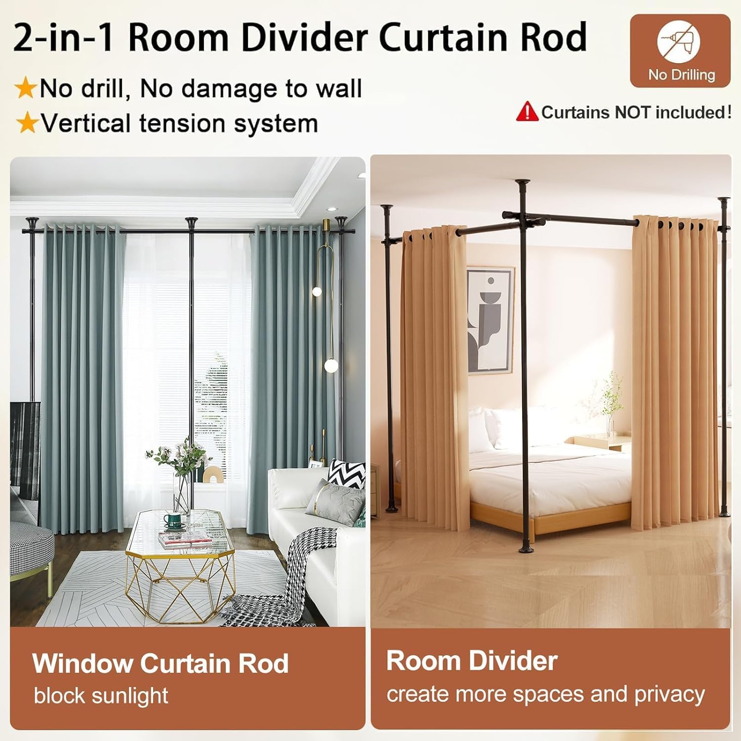 • No Drill Room Divider: This no-drill room divider curtain rod will not leave holes or damage in walls or ceilings, so it's an ideal solution for hard-to-install areas such as rental homes, apartments, dorms, etc. It's suitable for any hard surface such as tile floors, wood floors, plaster ceilings, popcorn ceilings, textured ceilings and so on.
