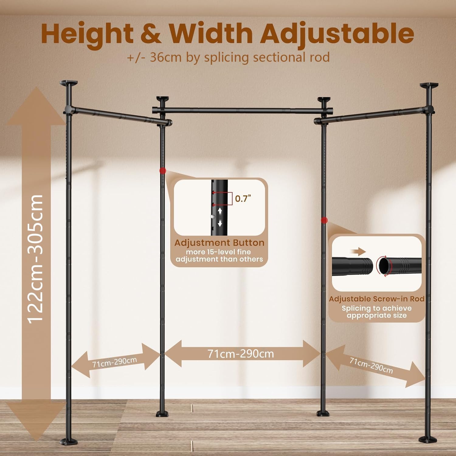 - Adjustable Height And Width: This room dividers partitions' height can extend from 121cm-304cm while its width adjusts from 71cm -434cm; making it customizable to fit any space. The extension rods can be used for both vertical poles and cross curtain rod, if you want it taller you can reduce the width, if you want it wider you can reduce the height. You can adjust the size by the number of extension rods and the spring clasp.