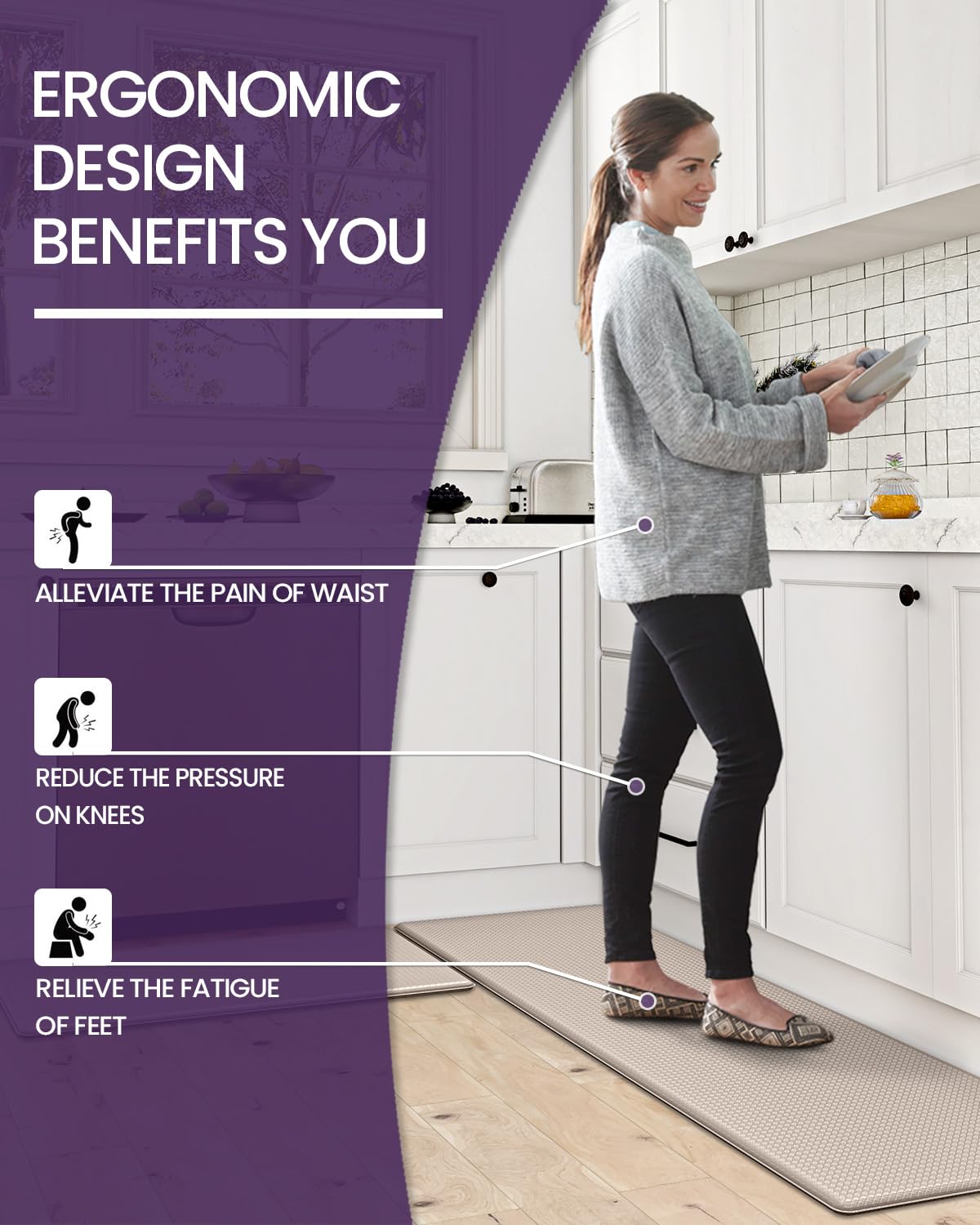 • Cushioned Anti-Fatigue Kitchen: When you stand for long periods of time to cook or wash dishes, this anti-fatigue mat is sure to provide comfort and help relieve pressure on your feet, knees, lower back, and joints.