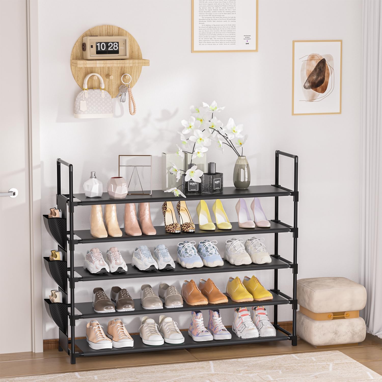 • Large capacity long shoe rack: This 5-tier shoe rack, black with a side bag, offers lots of storage room, 33.3" wide x 11.2" deep x 35.6" tall, and can hold 20- 25 pairs of shoes. A satisfying entryway shoe storage organiser for storing four- five pairs of shoes on each shelf.