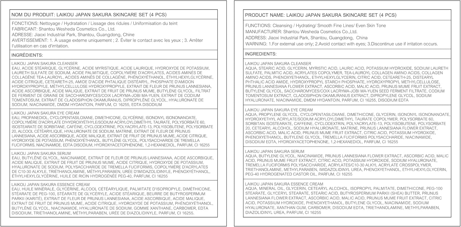 - Complete facial care process: LAIKOU Sakura Skin Set beauty gift can meet everything you need for facial care: Cleanser, Serum, Eye Cream, Face Cream.