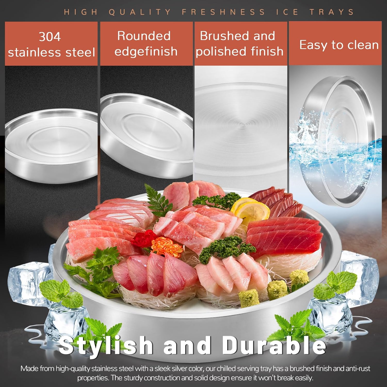 - Stylish and Durable: Made from high-quality stainless steel with a sleek silver color, our chilled serving tray has a brushed finish and anti-rust properties. The sturdy construction and solid design ensure it won't break easily.