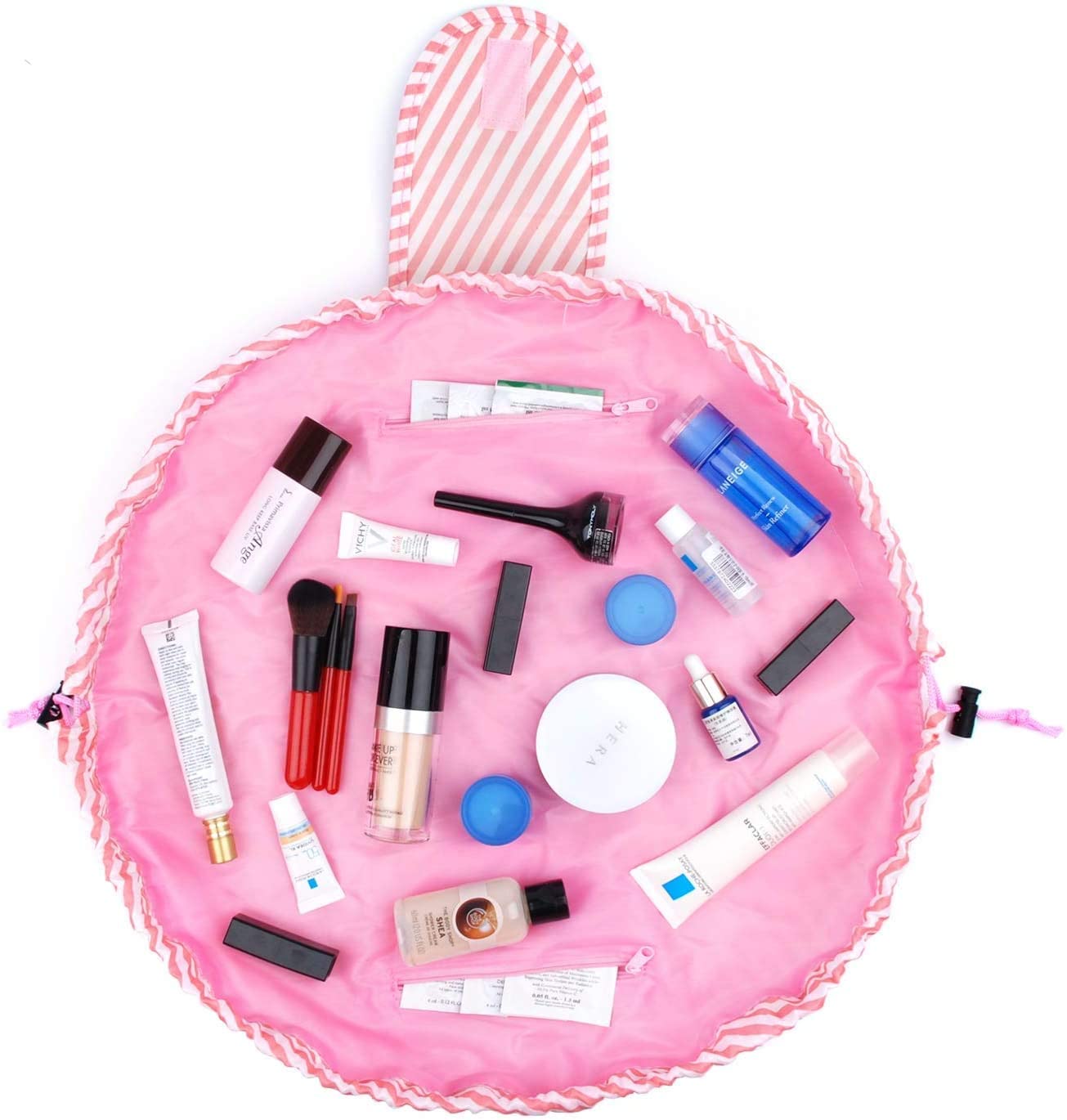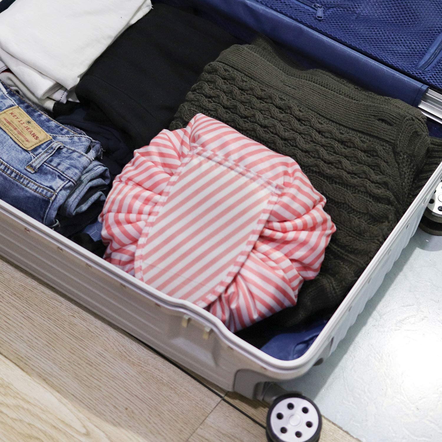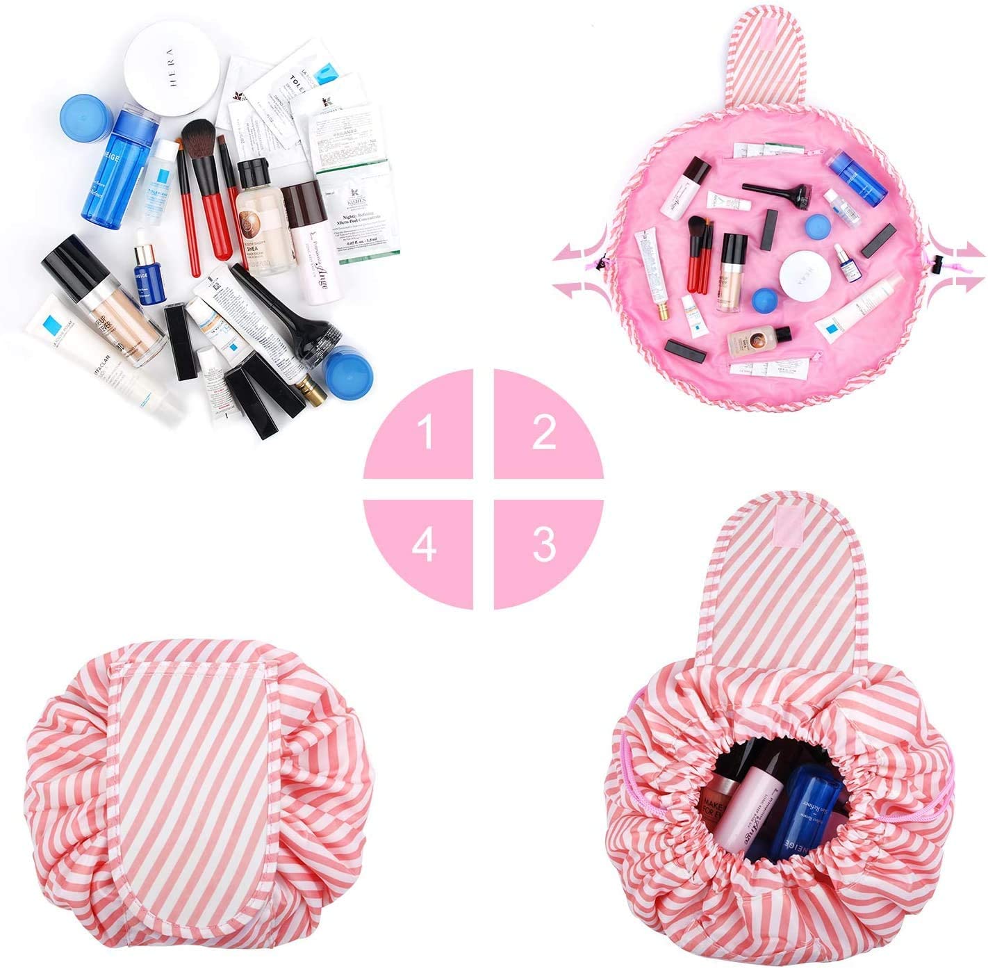 Portable Lazy Drawstring Makeup Bag Travel Cosmetic Bag Pouch Toiletry Organizer Waterproof Large for Women and Girls(Pink Stripe)