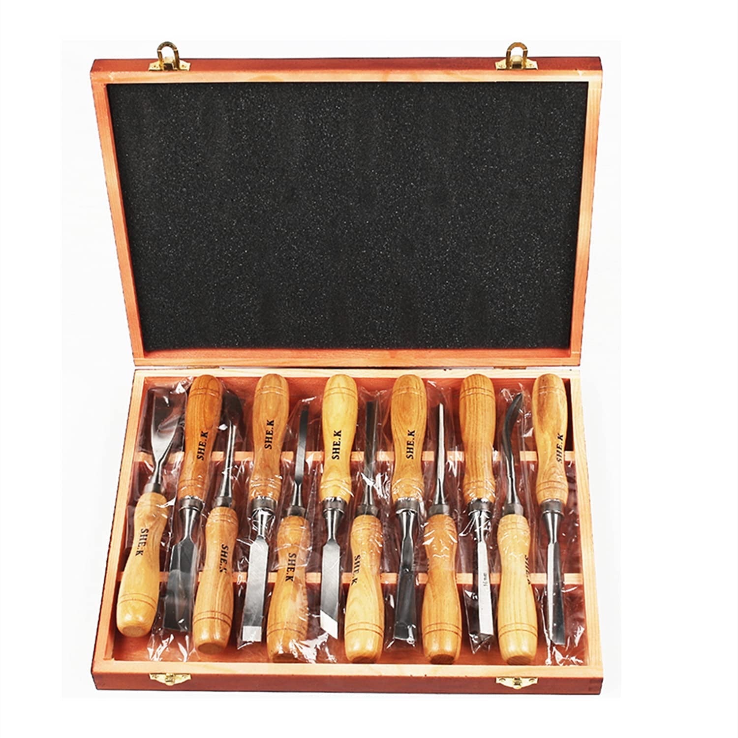 - Wooden Box: A set of 12 wood carving chisels, a basic set that has a good selection of the various shapes needed in woodworking.
