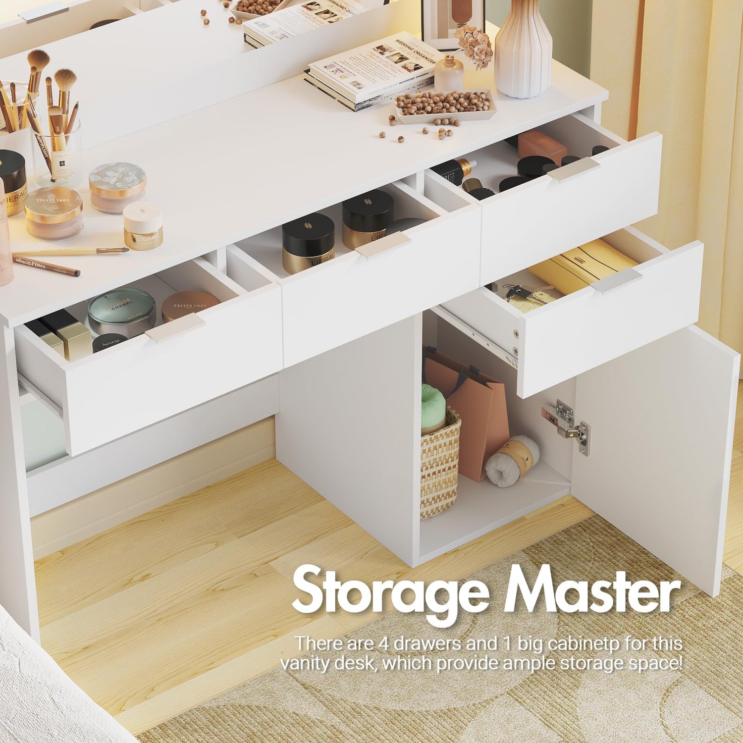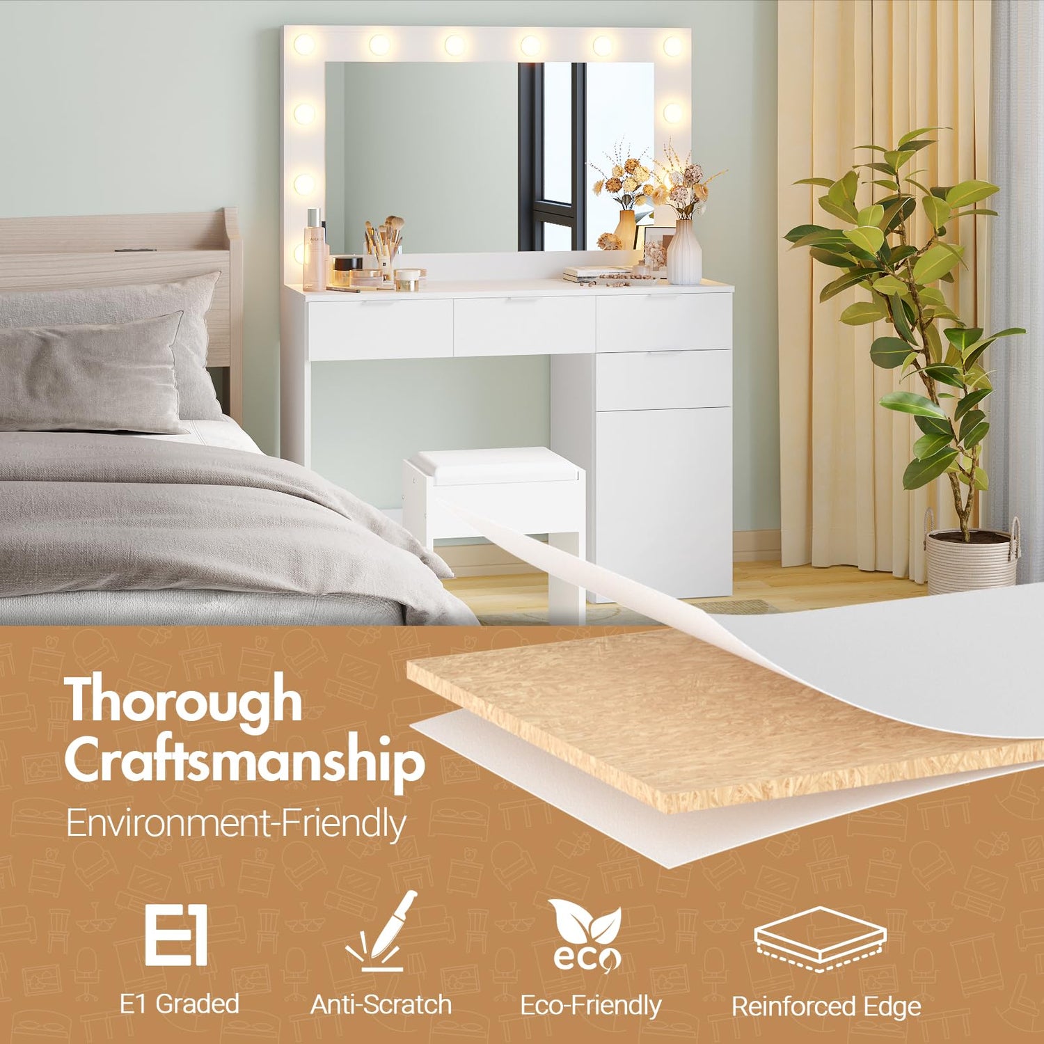 Dressing Table Stool Set with Large Make up Mirror 12 LED Bulbs Vanity Desk with 4 Storage Drawers and 1 Cabinet for Women Girls Kids Wooden Home Bedroom Furniture White