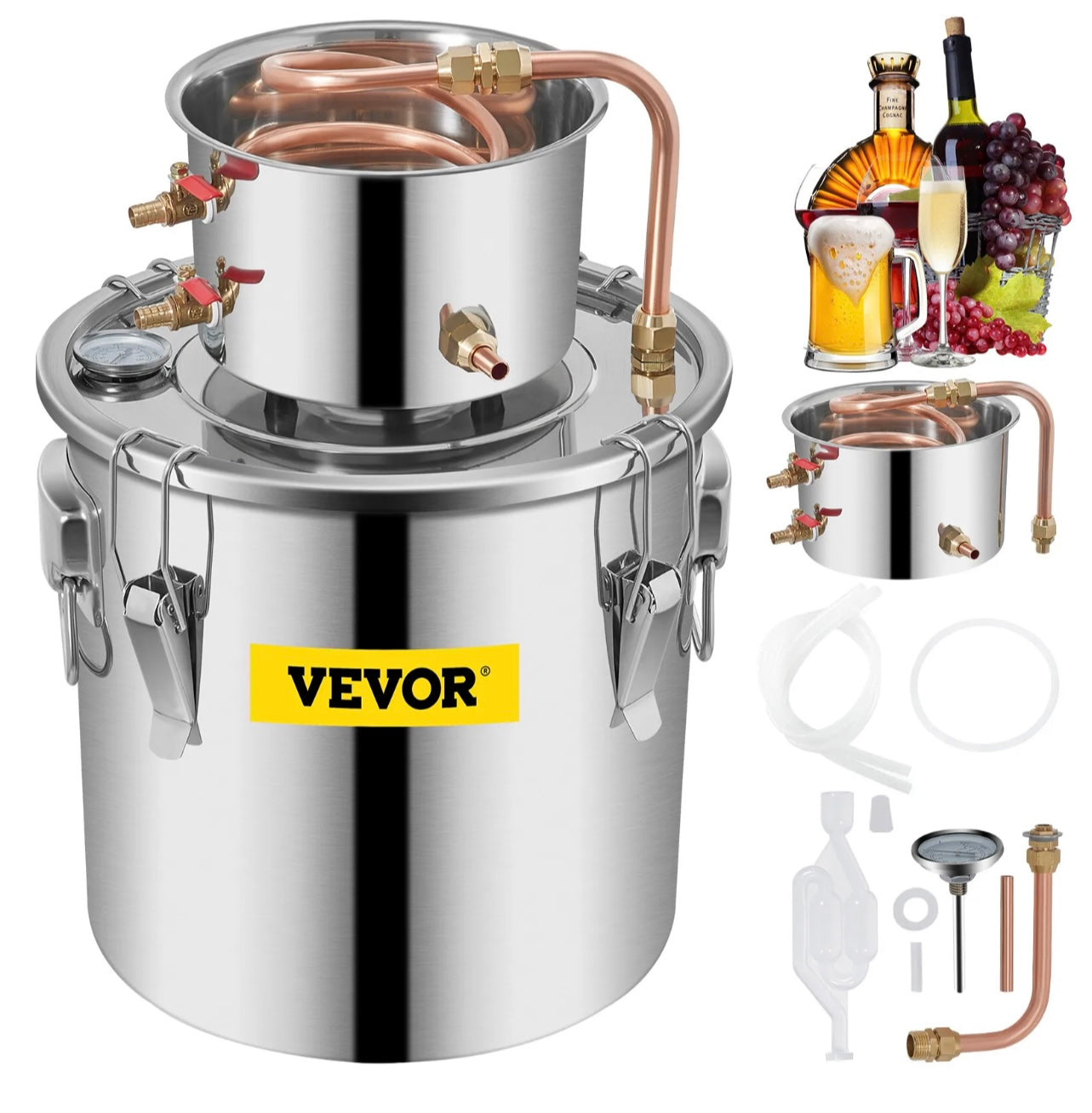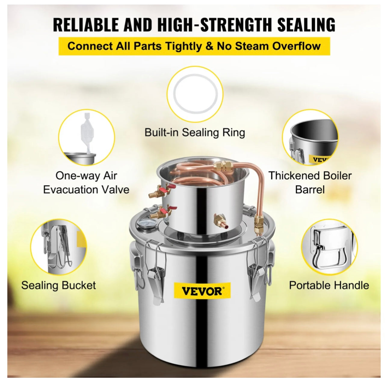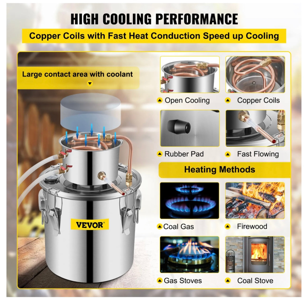 - Multipurpose Usage: Our distillery kit can be used in different situations, such as alcohol, ethanol, whiskey, distilled water, brewing, essential oils, hydrosols, etc. As long as you have this device, you can meet various needs, and it allows multiple heating methods, including gas stoves, firewood, electric ceramic heaters, etc.