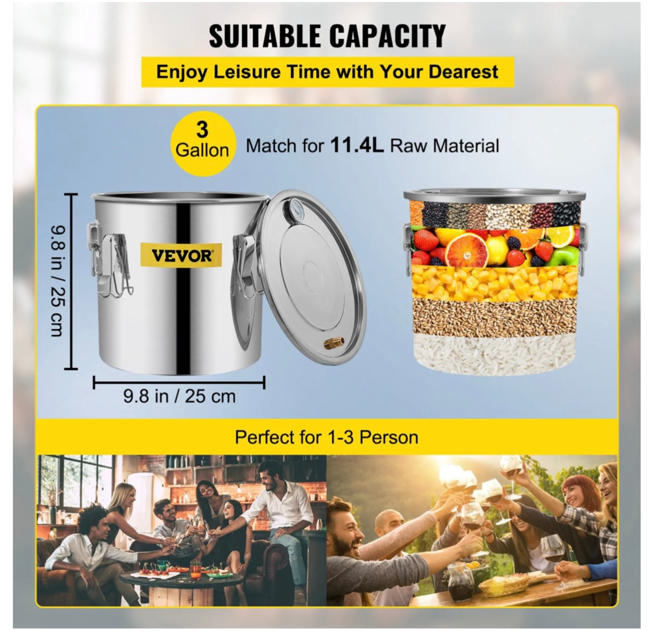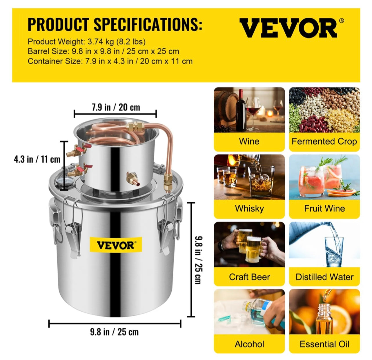 - 3 Gal Large Capacity: The capacity of alcohol stills is 3 Gal, which can match up with 11.4 liters raw material. Boiler barrel: 9.8" X 9.8" (25 x 25 cm). Condenser: 7.9" X 4.3" (20 x 11 cm). Suitable for you to enjoy leisure time with your families or friends. All parts are made of food-grade materials, including silicone, stainless steel, and copper.