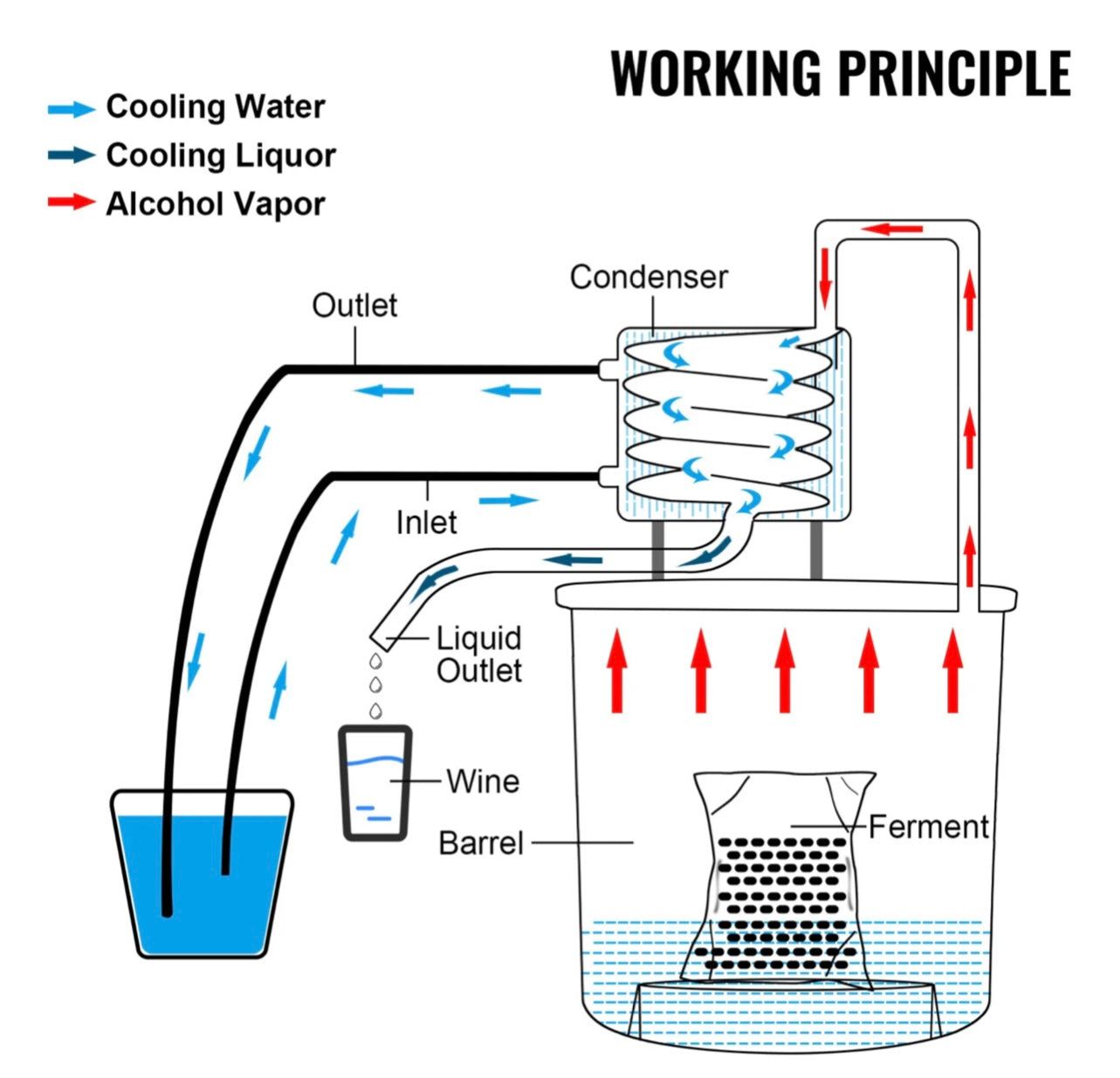 A full set of alcohol distiller, suitable for beginners and experts, with excellent cooling performance. Can be used to distill fruit wine, water, brandy and essential oils, apply for various heating methods like gas stoves, firewood, and electric ceramic heaters.
