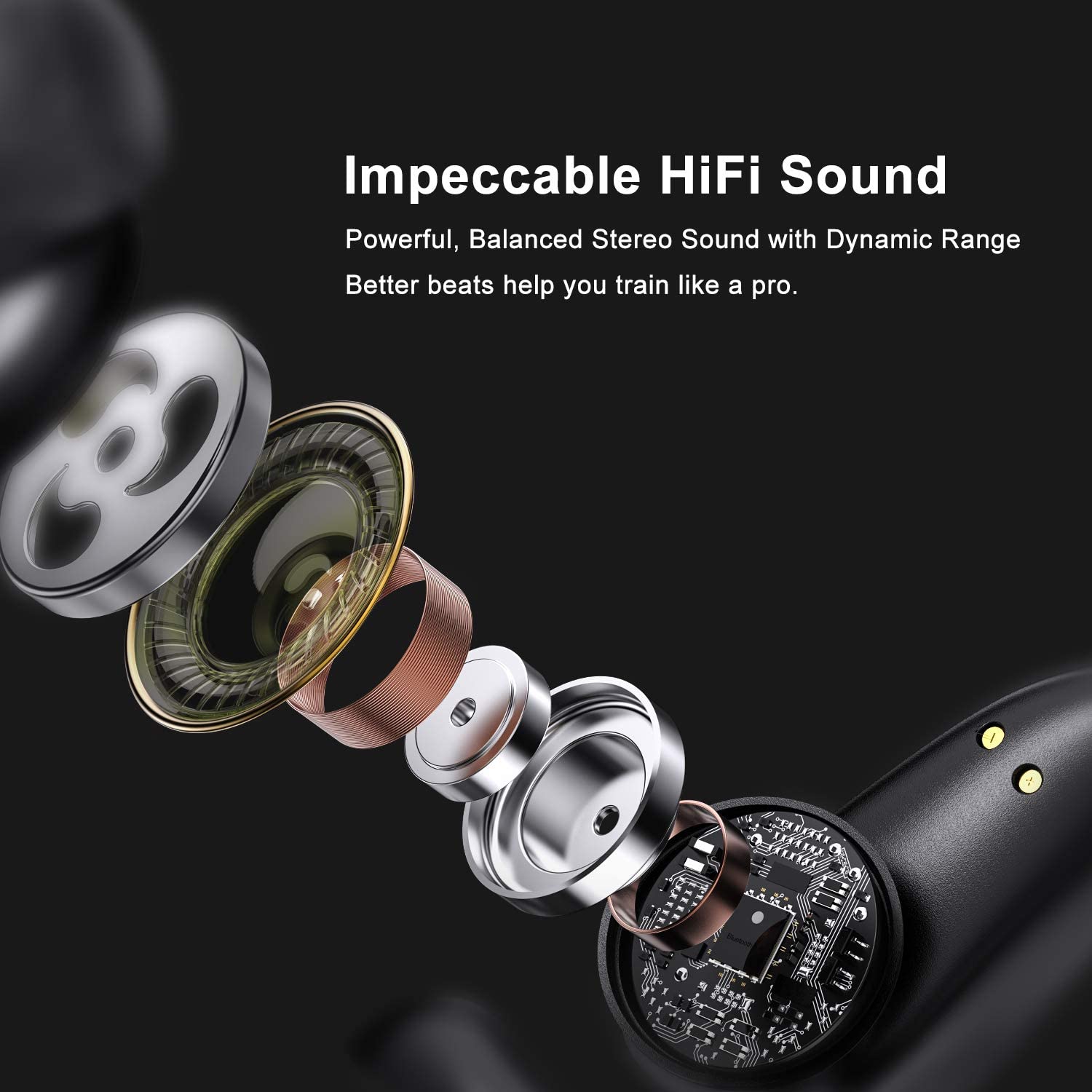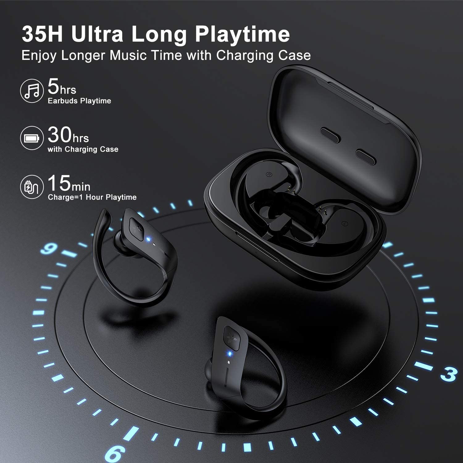 - 35H ULTRA LONG PLAYTIME: This Sport earbuds offer up to 5 hours of use on a single charge - long enough to power you through almost any workout. What’s more, the portable charging case will provide 6 additional full charges (or extra 30 hours of battery life) to keep them ready to go again for all-day uninterrupted music. A quick 15-minute charge can boost 1 hour of playback.