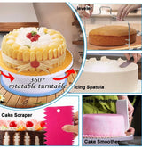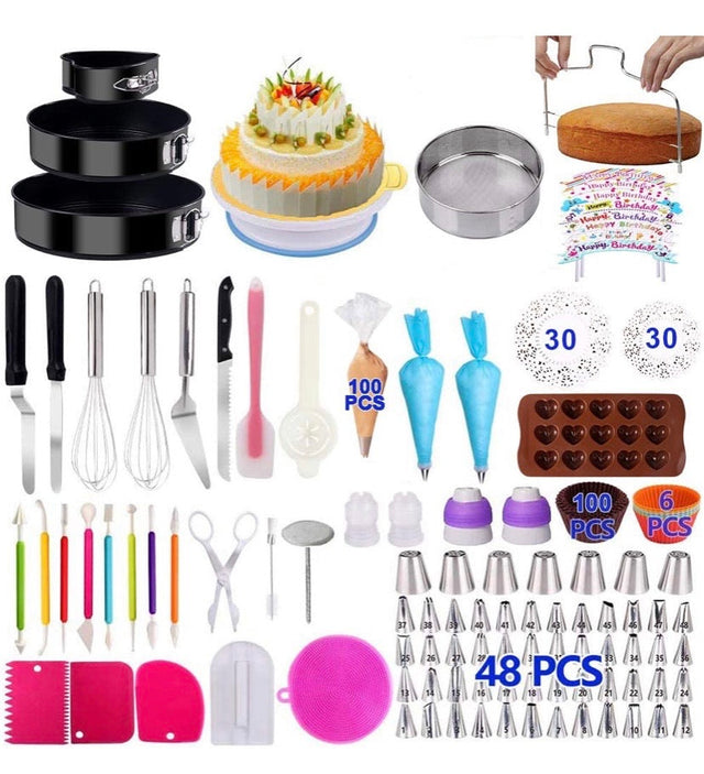 - 282 PCS COMPLETE CAKE SET: Including everything you need to start making cakes like a PRO! Inch Turntable, Leakproof Round Cake Pans, Egg Beaters, Muffin Cup Moulds, Paper CupCakes, Carved Pens, Numbered Icing tips, Disposable Bags, flags, Russian tips, Egg Tart Moulds, Scrapper Sets, Silicone Bags, Russian Tricoupers, Ciong Coupers, Cream Scraper, Straight & Angled Spatula, Cake Server, Cake knife, Cake Smoother, Cake Board, Decorating Pen, Flower Nail & Lifter, Cleaning Brush, Pattern Chart