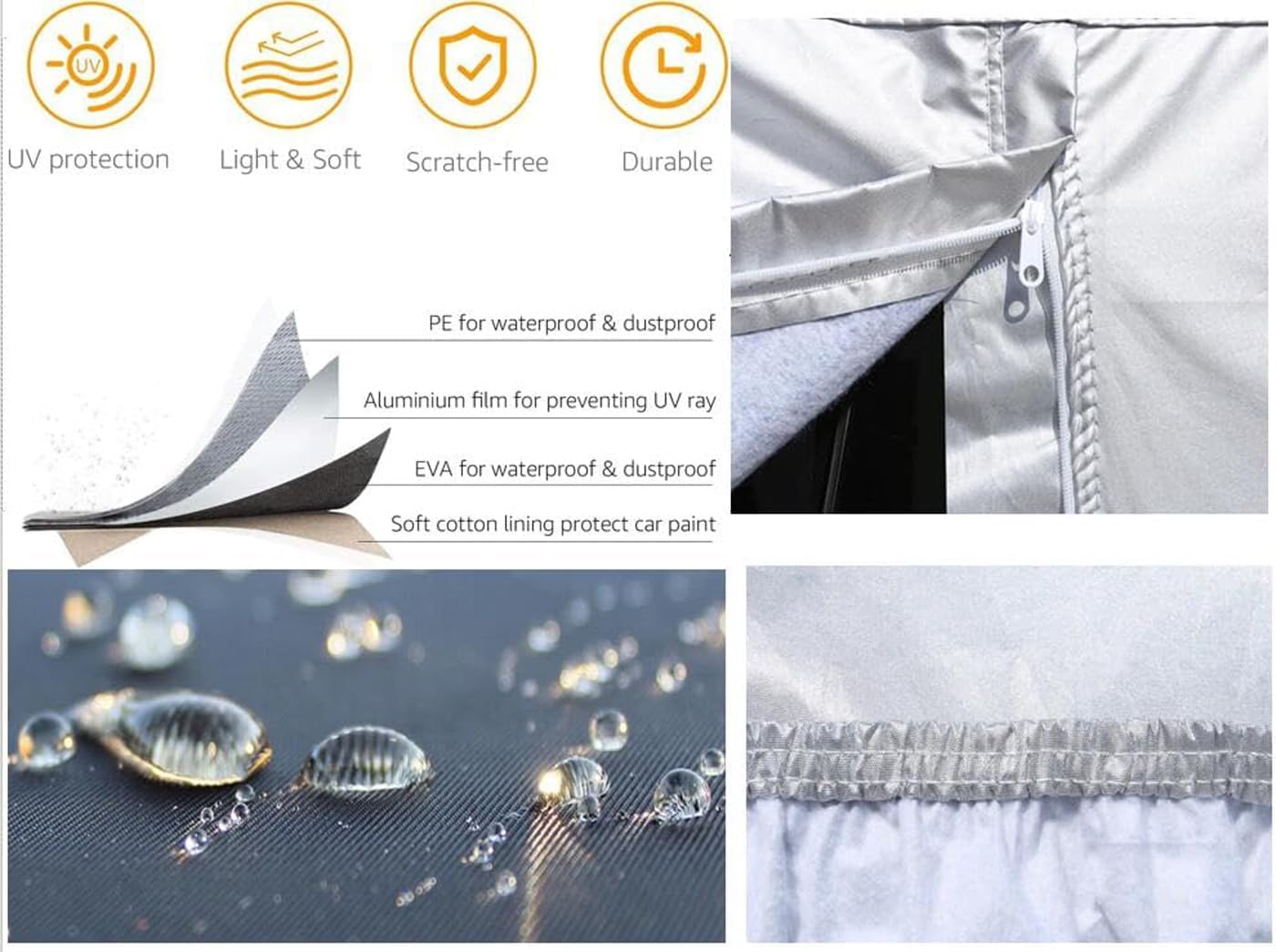 - Car cover is 100% waterproof for all-weather protection. Provides 6 layers of protection. Car cover combines multiple layers of protection against extreme weather conditions such as hail, rain, snow and ice, as well as dents, scratches, bird droppings, tree sap and more.