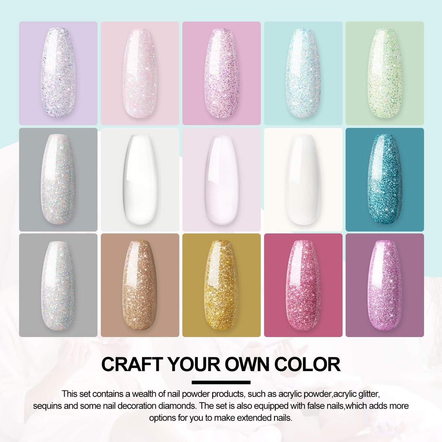 - 24 Colors Decoration Glitter Powder: This acrylic nail kit contains 24 different colors of glitter powder for decoration your nails. This powder is delicate, shiny and colorful, easy to use with acrylic nail powder, suitable for all seasons.