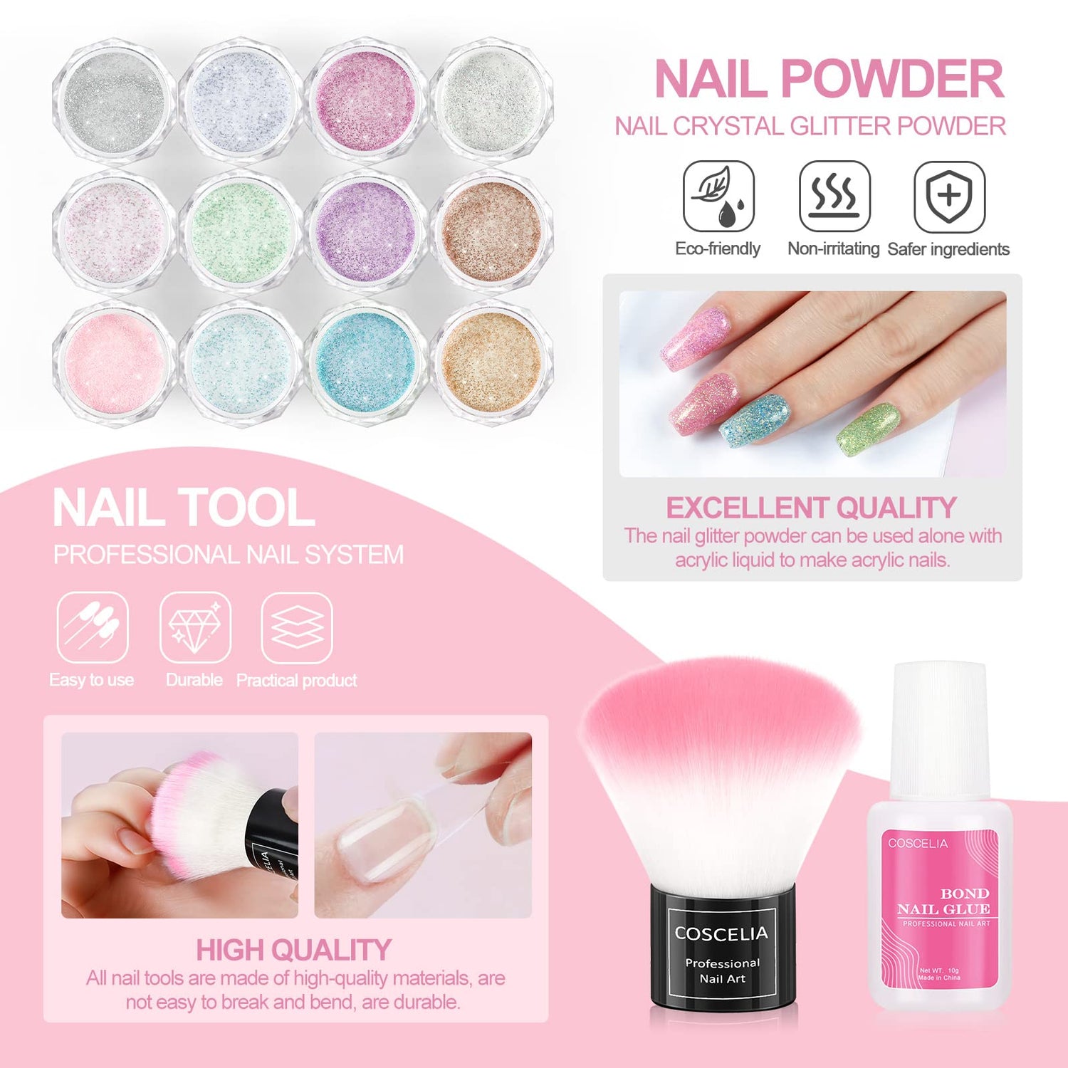 - Long-Lasting & High Quality: COSCELIA acrylic powder can last for 14+ days with proper application, it's made with natural formula, using advanced processing technology to ensure durability , a wide selection of colors and designs will give you an attractive appearance!