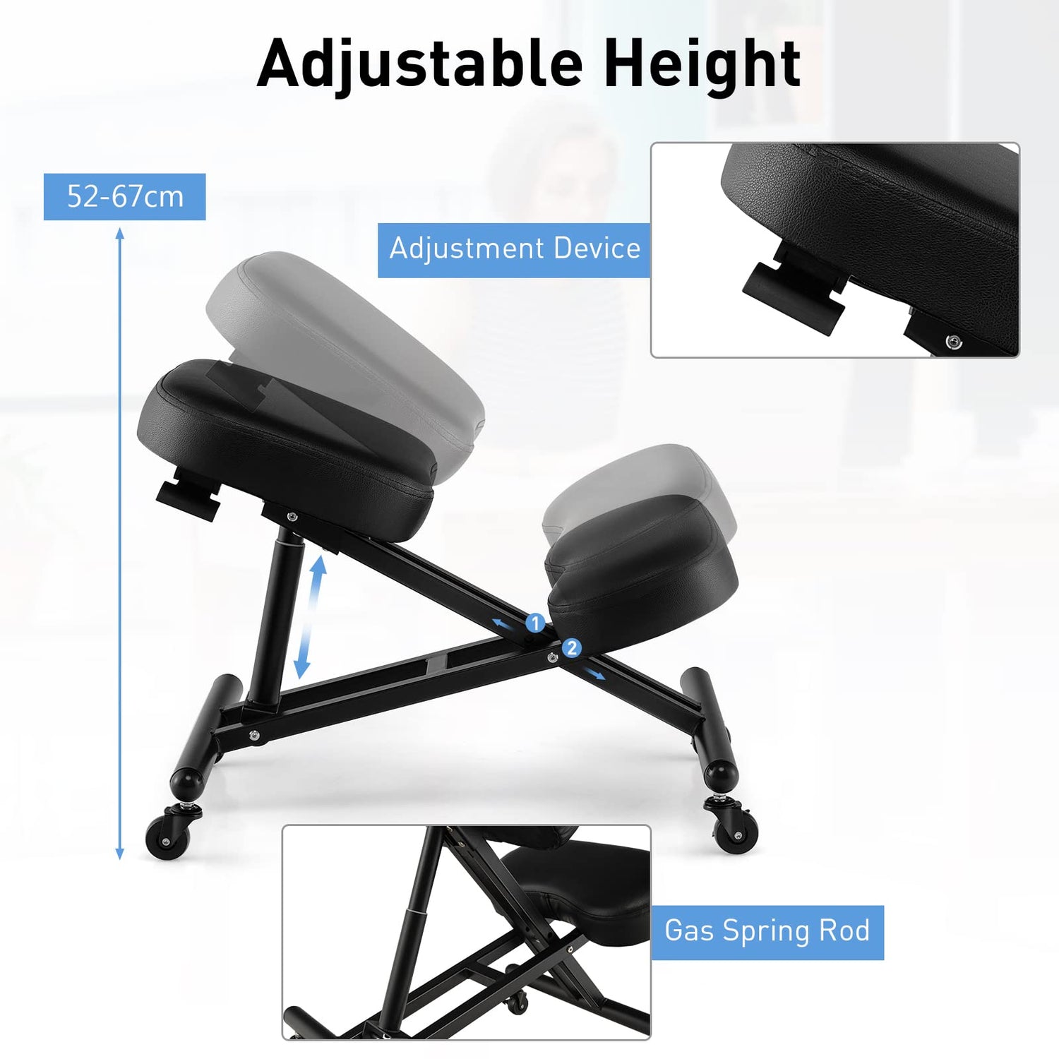 - Height-Adjustable Kneeling Chair: You are allowed to freely adjust the adjustment device to control its gas spring rod, which helps you to easily change its seat height from 52cm to 67cm to find the most suitable position. At the same time, the angle between seat and kneeling pad will range from 20°-80°. Therefore, it is able to fulfill your different requirements.