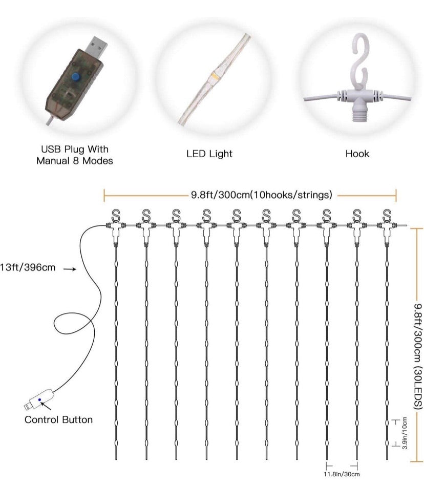 - Easy to Use- The whole string light measures 9.8inch in length and 9.8inch in width, consisting 10 strips and 300 lights, simple to sort out and install.