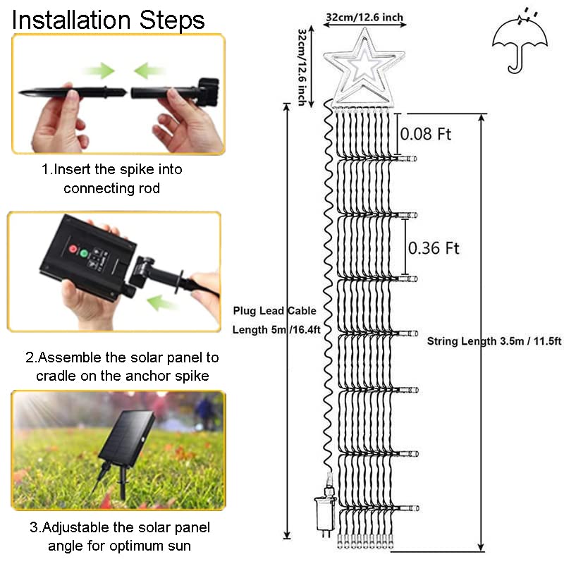 - Specifications: NBE Outdoor/Indoor Christmas Decorations Solar Star Lights. Waterfall Lights are Made Up of a 12-inch Star Light + 9 Strings of 11.5 ft Long Lights. There are 350 LED Lights. The Plug Cable has 16.4 ft in Length & Can Decorate Christmas Trees from 8 ft to 13 ft in Height.