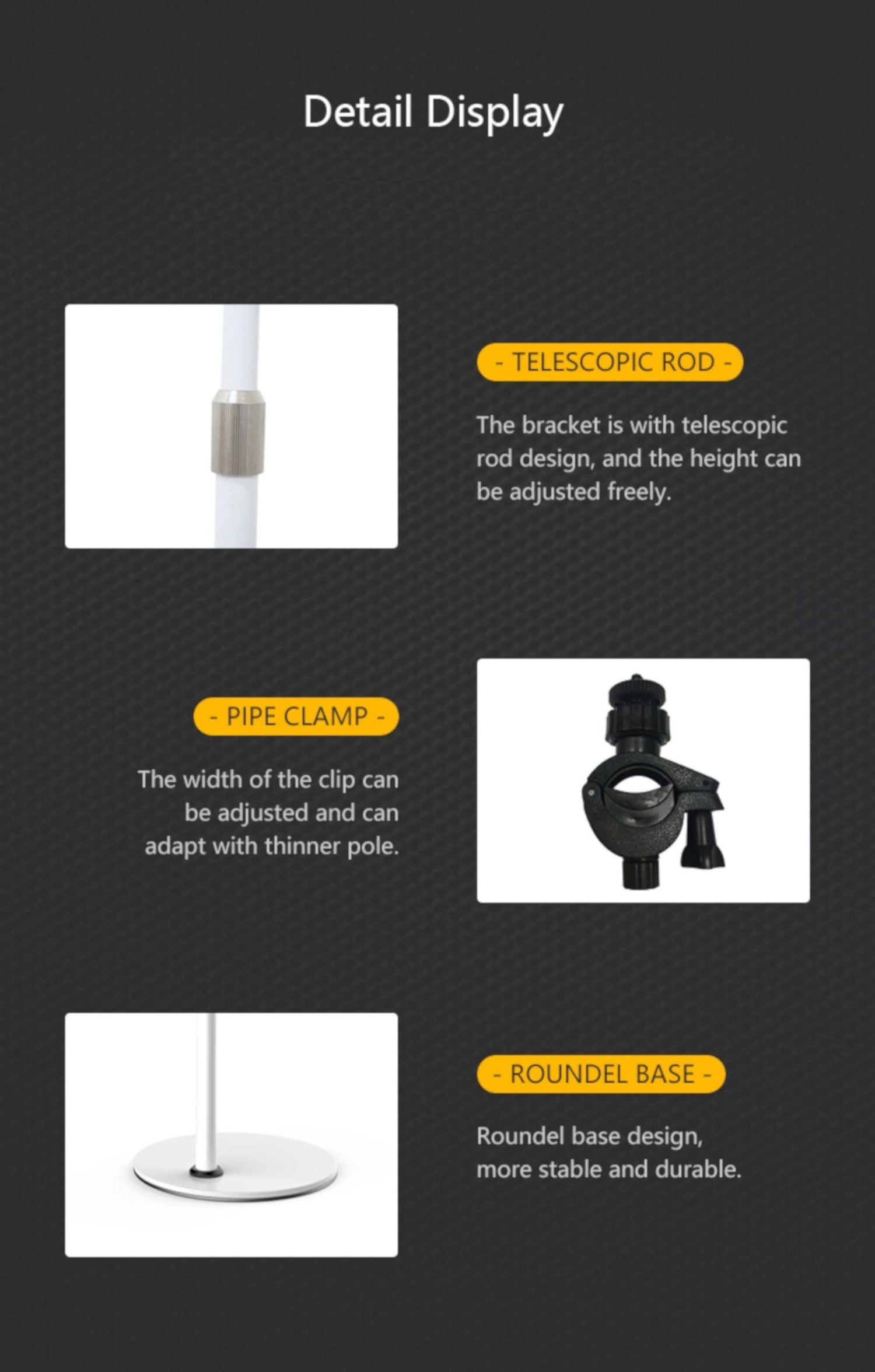 • Quality Material: Utilisation of 64 LED light bulbs bring about high brightness, low energy consumption and a long lifecycle. A metal-made rod and stand with a unique matte texture achieves durability, anti-slip and premium styling.