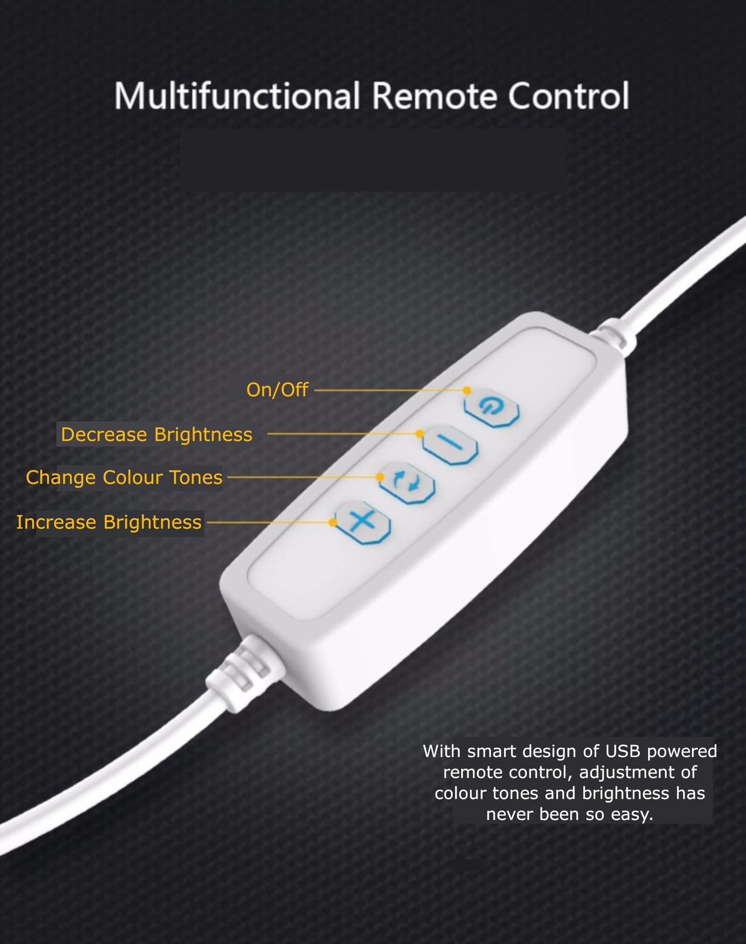 • Adjustable Brightness: 10 levels of brightness (for each colour tone) can be adjusted by pressing the “+” or “-” button on the USB-powered remote control.