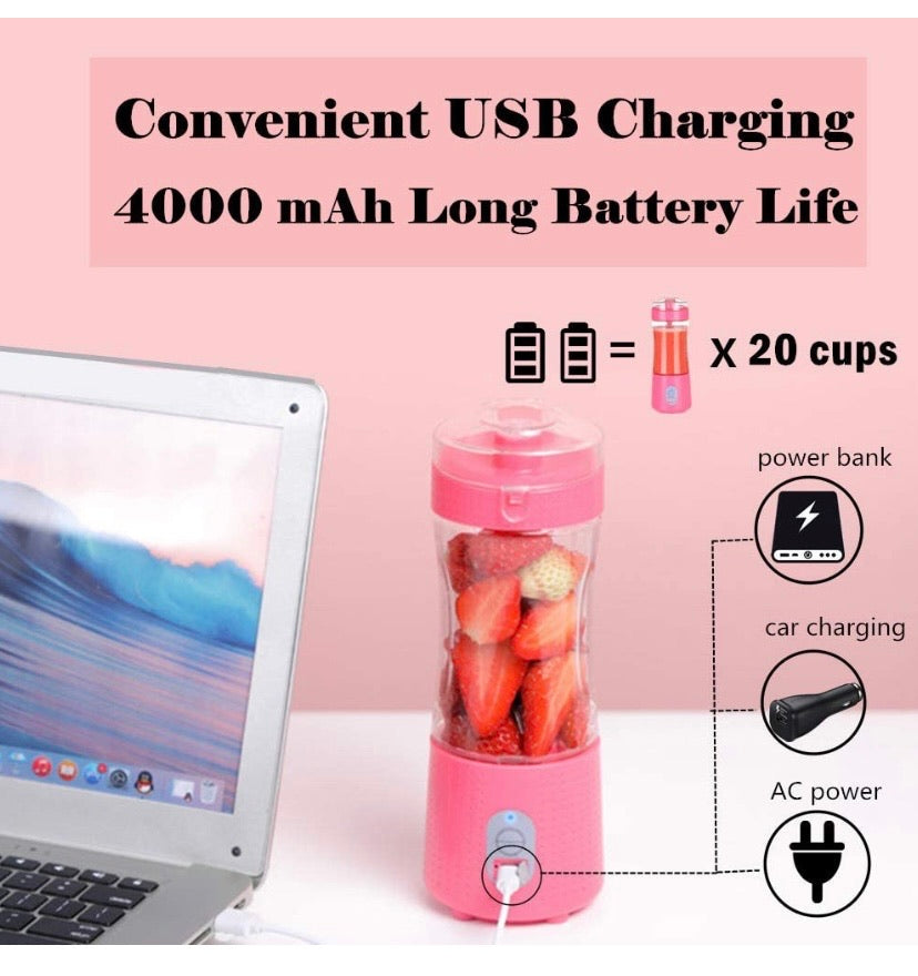 - [4000Amh Rechargablel Portable Blender] Built-in 4000mAh Battery enables making 20 cups juice with single full charge for 3 hours.Comes with USB cable, this single serve blender can be easily charged by power bank, laptop, computer or other usb devices, keep your travel on the go.
