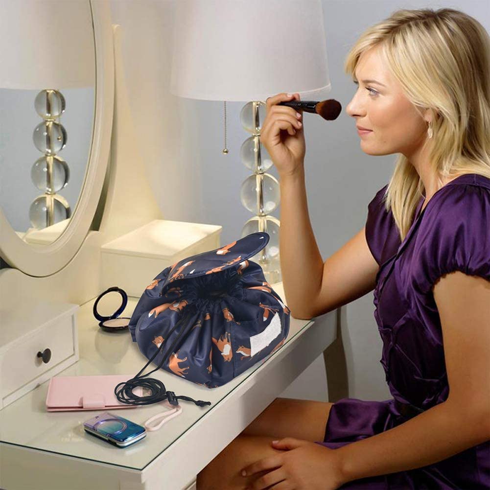 Portable Lazy Drawstring Makeup Bag Travel Cosmetic Bag Pouch Toiletry Organizer Waterproof Large for Women and Girls (Gold Fox)