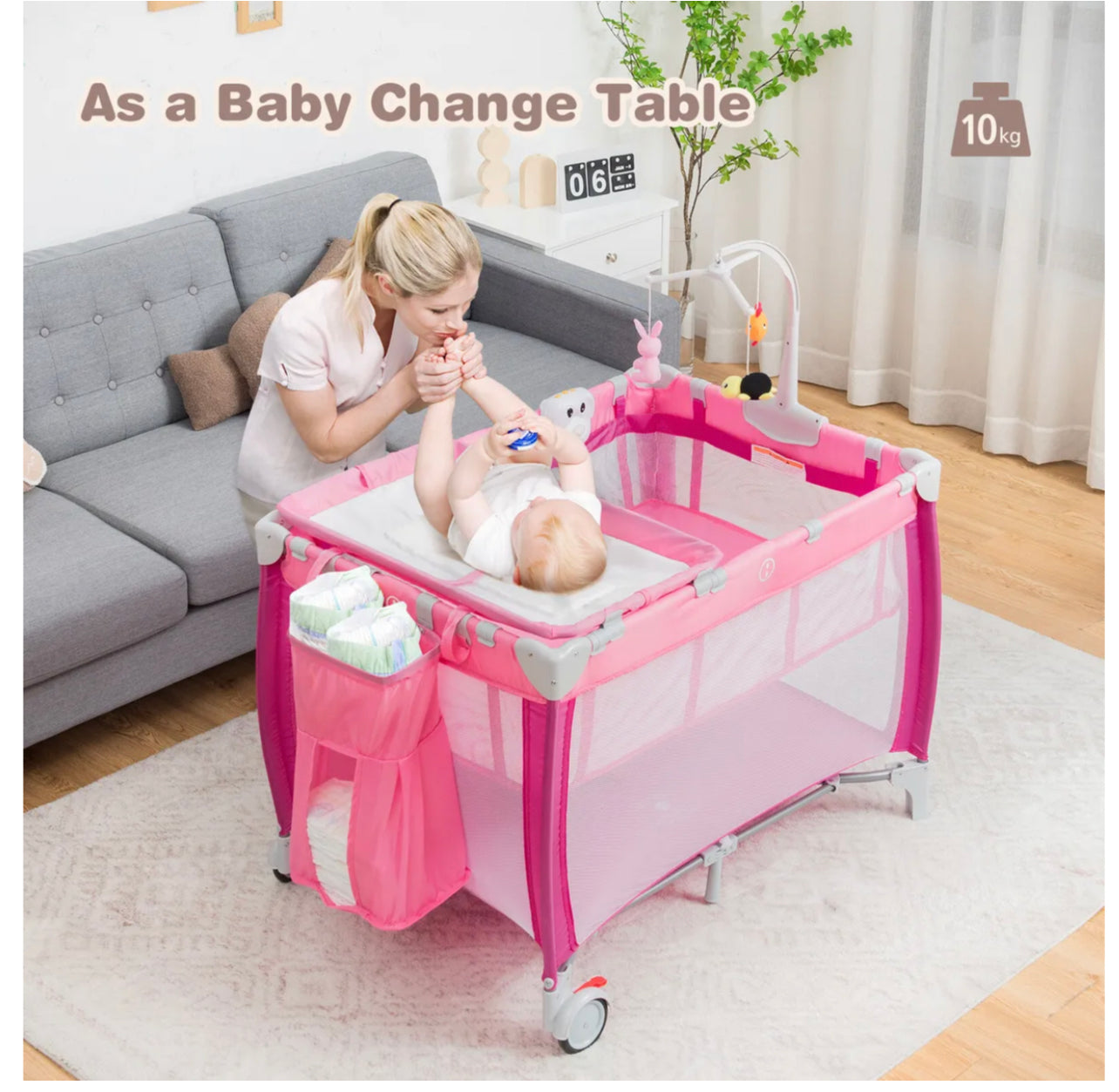 - 3-in-1 design includes a baby playpen, changing table and bassinet