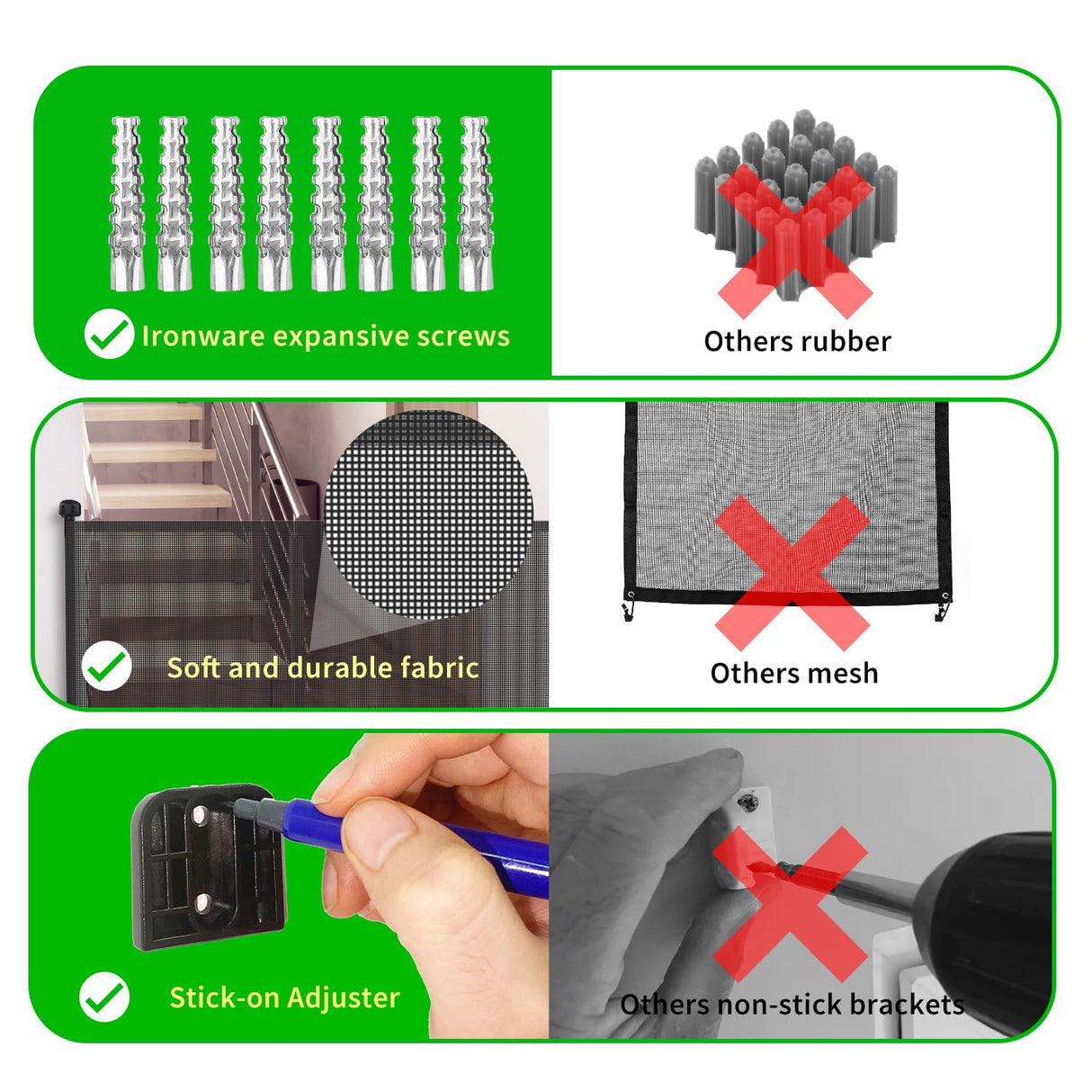 - Premium & Durable Material: Crafted from high-quality, durable mesh, this long baby gate is designed to withstand the adventurous spirit of your little explorer or furry friend. Despite its robust construction, the mesh design allows for visibility, enabling you to always keep an eye on them.