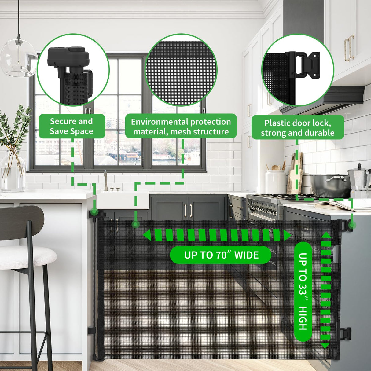 Upgraded Retractable Baby Gate for Stairs, 33"Tall Expands 70"Wide Ideal Safety Solution Dog Gate for Stairs Doorways Hallways Indoor/Outdoor Mesh Baby Gate Retractable Screen Door(Black,86CMx180CM)